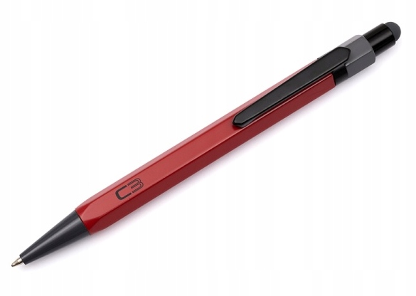 Długopis posiada naciskowy mechanizm oraz czerwoną obudowę. W dolnej części długopisu widnieje logo C3.