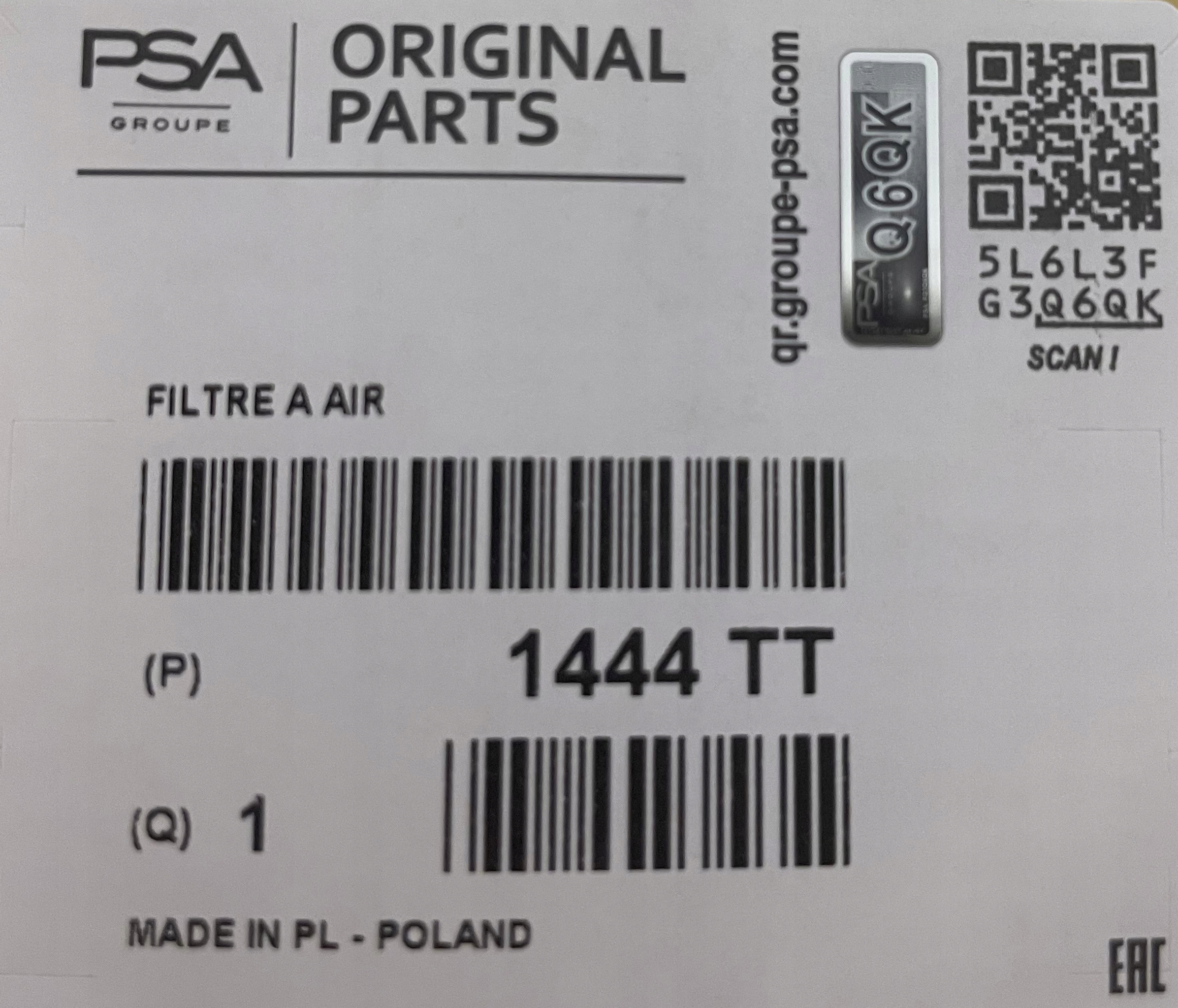 Filtr powietrza Citroen OE / DS OE / PEUGEOT OE 1444TT