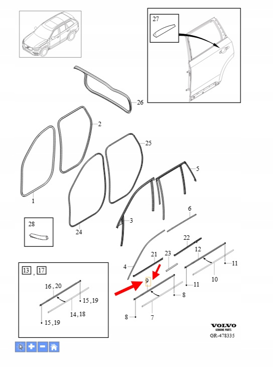 LISTWA ZGARNIAJĄCA SZYBY DRZWI PRAWY PRZÓD VOLVO XC90 2016- OEM/OE 31479470