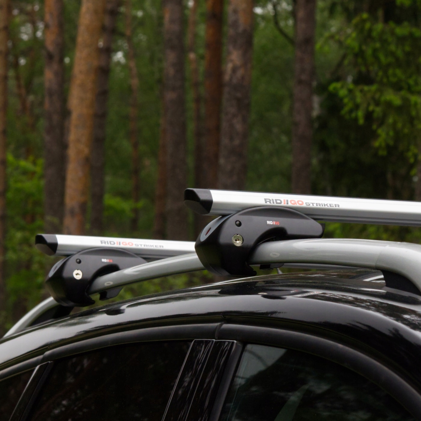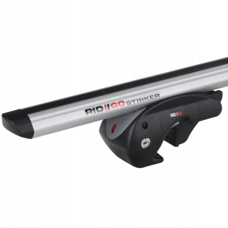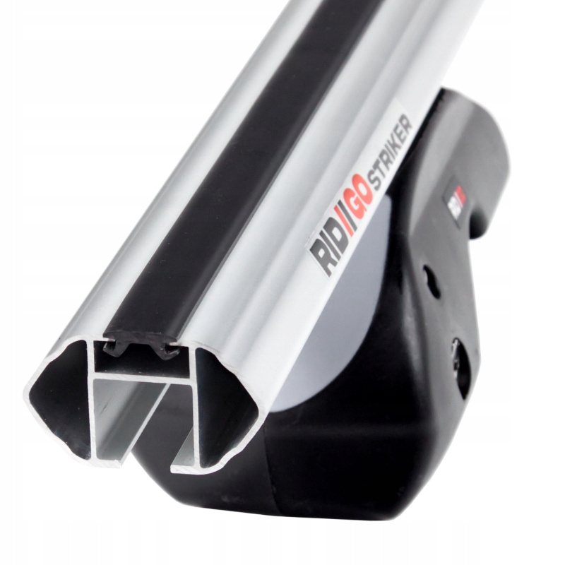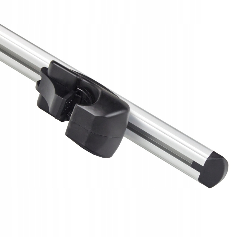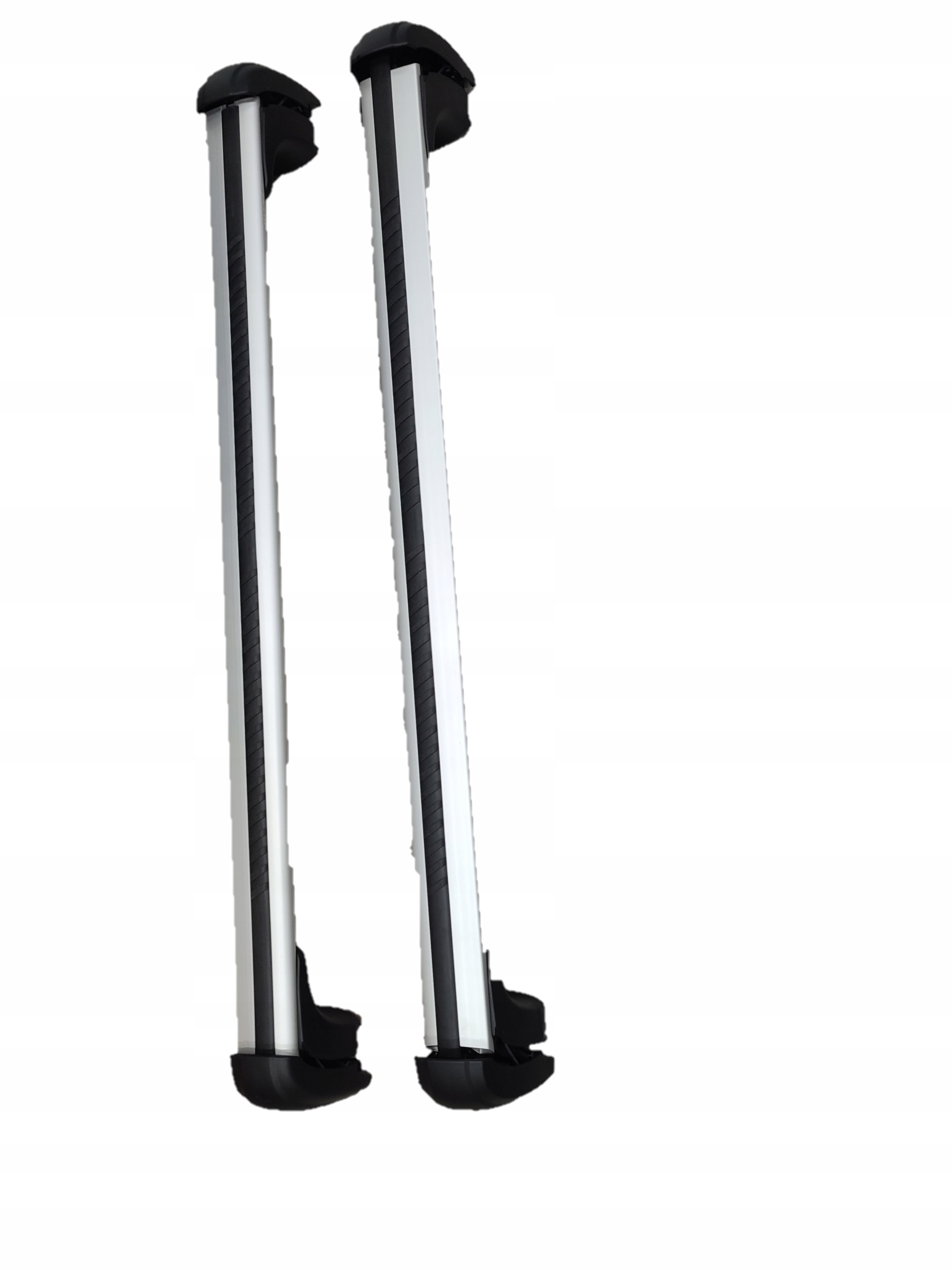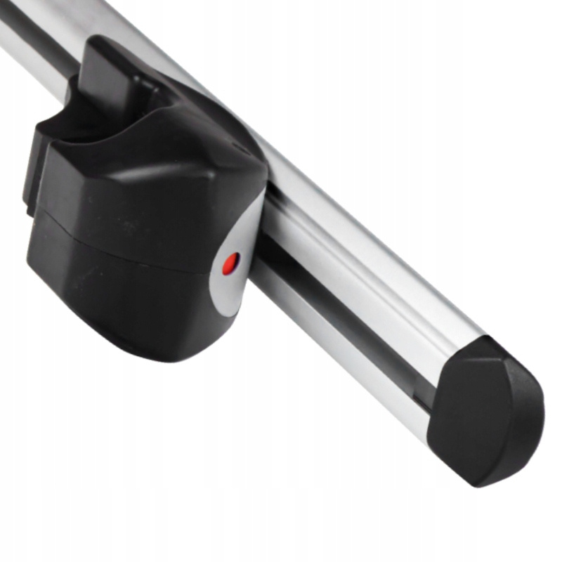 Zestaw 2 poprzecznych belek dachowych z anodowanego aluminium, zamykanych na klucz na każdej podstawie.