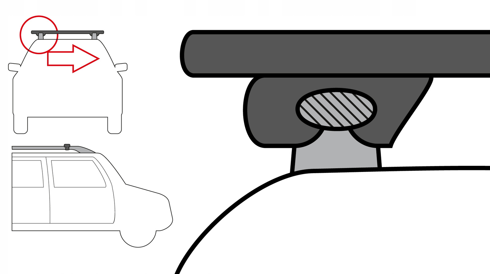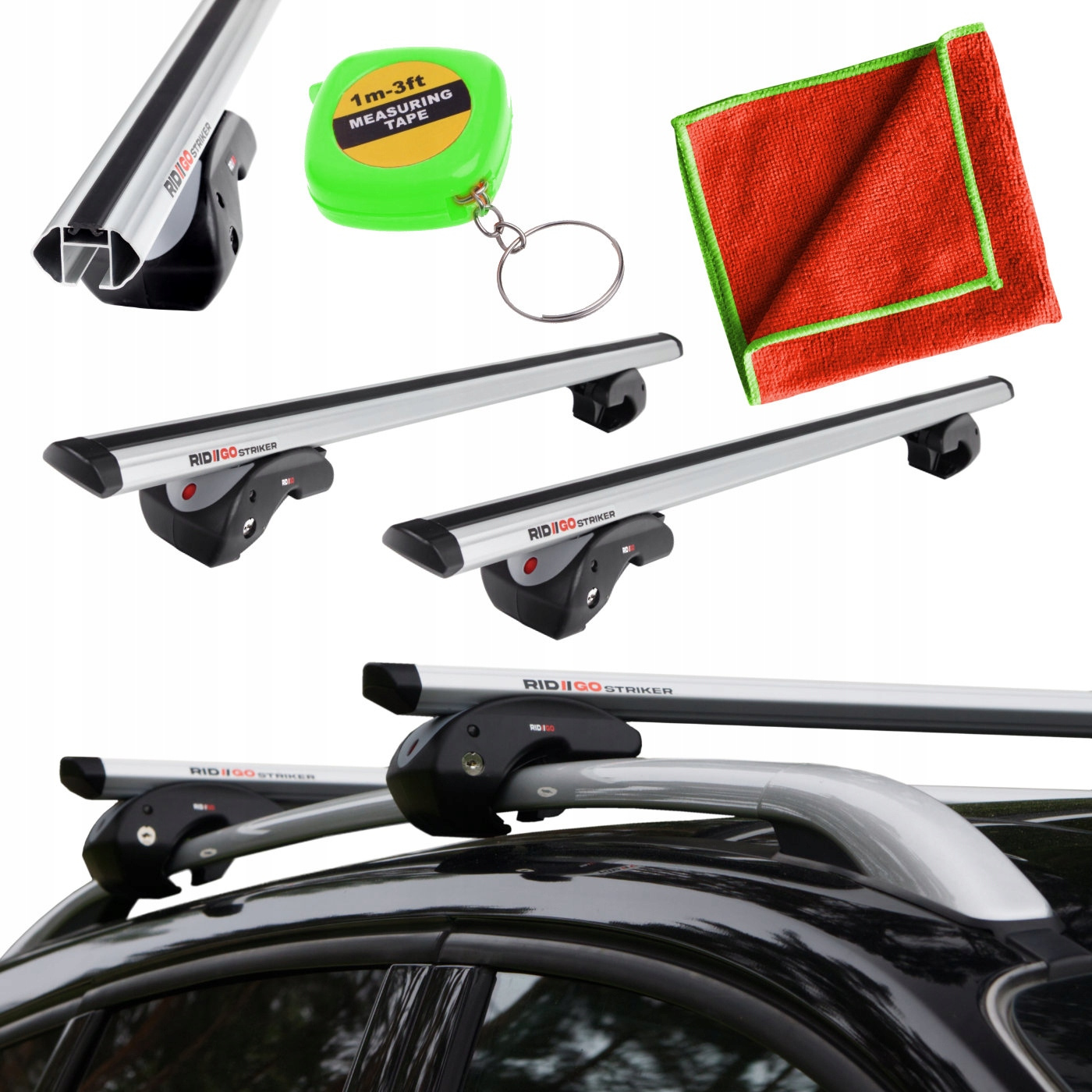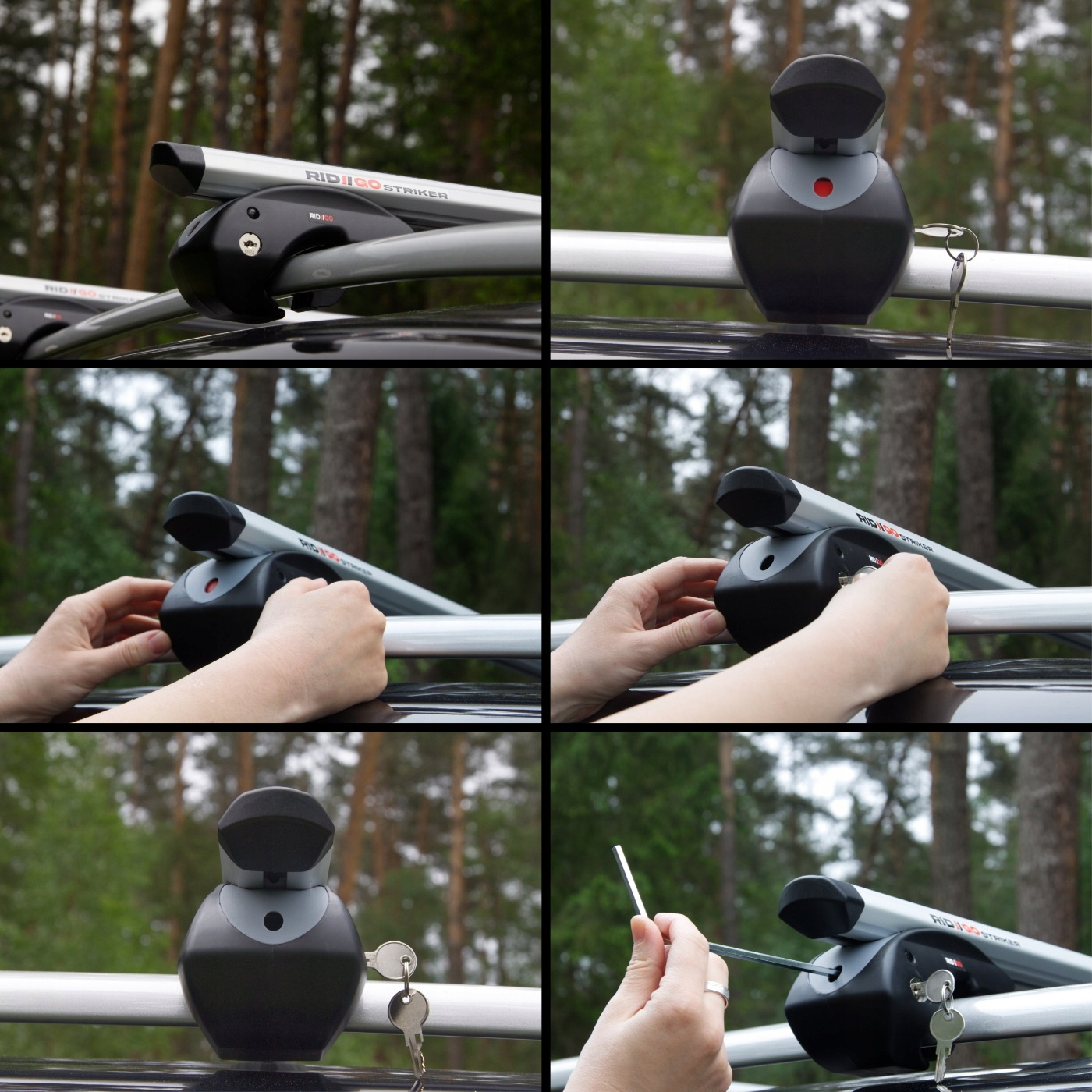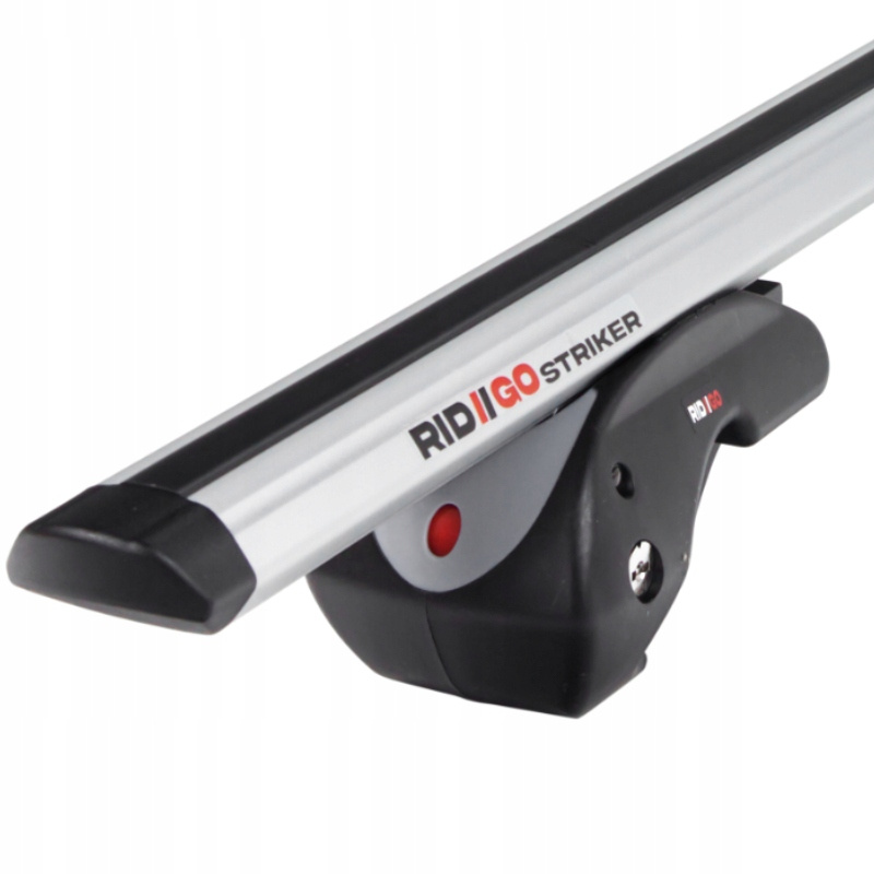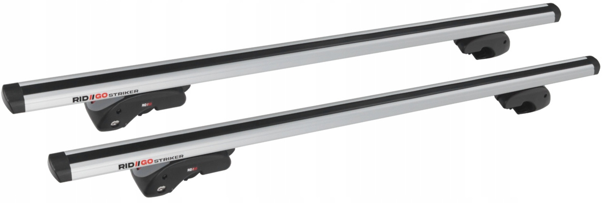 Zestaw 2 poprzecznych belek dachowych z anodowanego aluminium, zamykanych na klucz na każdej podstawie.