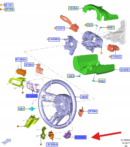 PRZEŁĄCZNIK KIEROWNICY PRAWY DOLNY FORD MUSTANG 17- 2161894 _ JR3T-9E740-EA