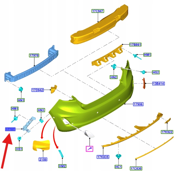 ŚLIZG UCHWYT ZDERZAKA LEWY TYŁ FORD FIESTA 2017- 2147311 _ H1BB-17A882-A1E