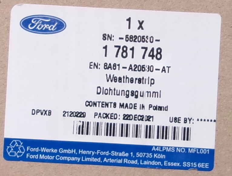 USZCZELKA DRZWI PRZÓD PRAWA FORD FIESTA Mk7 2009- 1781748 _ 8A61-A20530-AT
