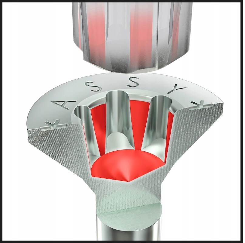 - Doskonałe dopasowanie głowicy 90° do elementów mocujących z metalowymi pogłębieniami