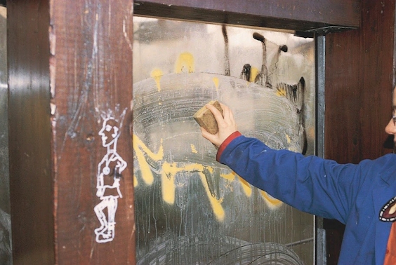 Przed nałożeniem zawsze sprawdzać zgodność materiału i blaknięcie koloru w niewidocznym miejscu, nakładając środek do usuwania graffiti szmatką.